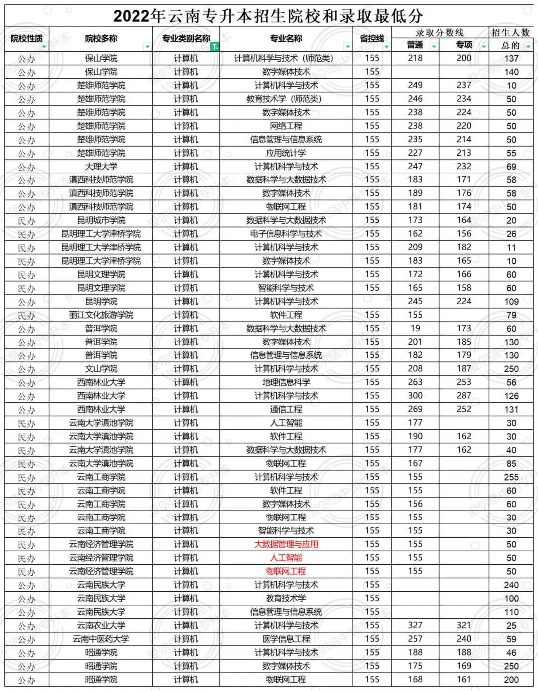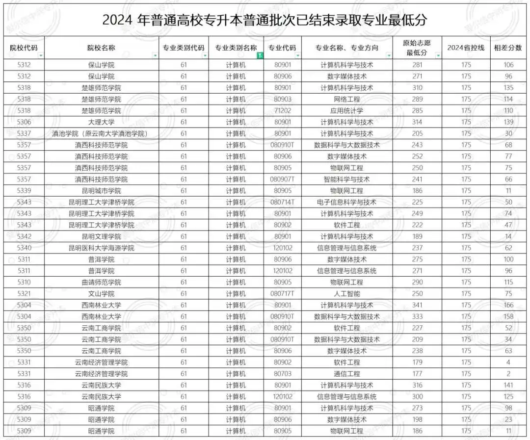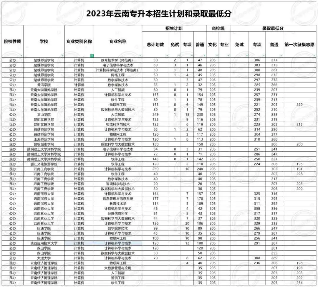 2024年计算机,招生院校有17所,分别为:7所民办(滇池学院、昆明城市学院、昆明理工大学津桥学院、昆明文理学院、昆明医科大学海源学院、云南工商学院、云南经济管理学院)10所公办(保山学院、楚雄师范学院、大理大学、滇西科技师范学院、普洱学院、曲靖师范学院、文山学院、西南林业大学、云南民族大学、昭通学院)