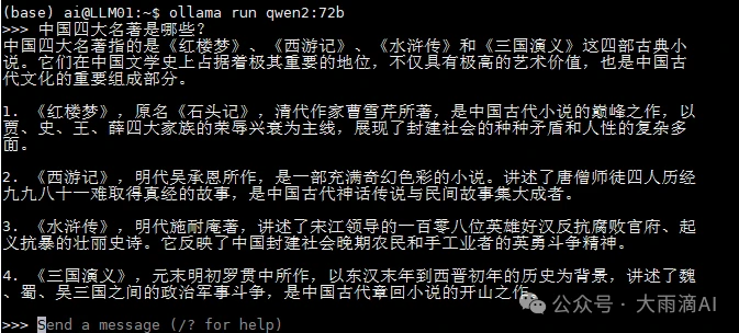 下载完自动进入交互模式(我这里已经下载过该模型,因此直接进入交互模式了,如果是新下载模型,会看到下载过程),提个问题试试,验证模型下载运行成功。