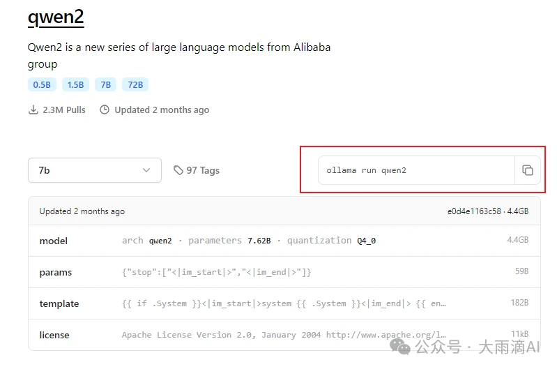 如果已经下载过Ollama提供的qwen2 base模型,也可以直接通过 ollama show 命令找到相关的信息,然后复制出来。