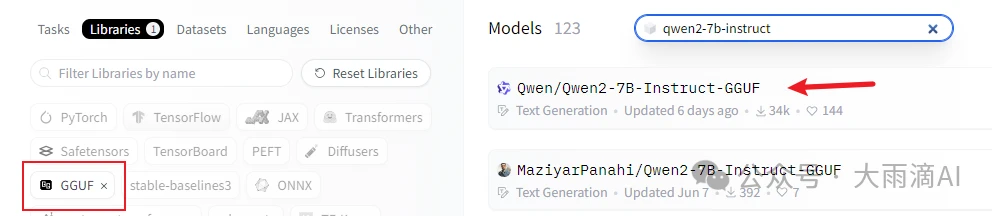 - Ollama可以直接装入 GGUF 格式的模型文件,因此优先选择下载这种模型文件。如果只有safetensors 格式的模型,需要先转换成 GGUF 格式,后面会介绍。在HF上搜索 “qwen2-7b-instruct",并筛选libraries标签为GGUF的模型,