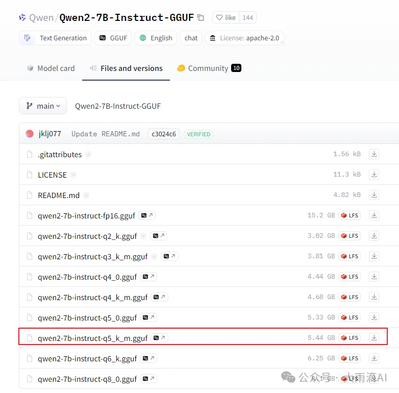 - 进入模型的 “Files and Version” 页面,选择 q5_k_m 模型文件下载,