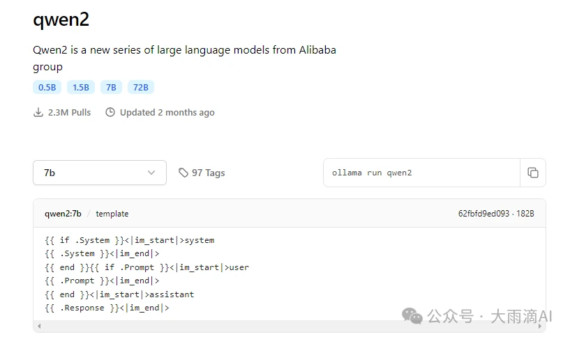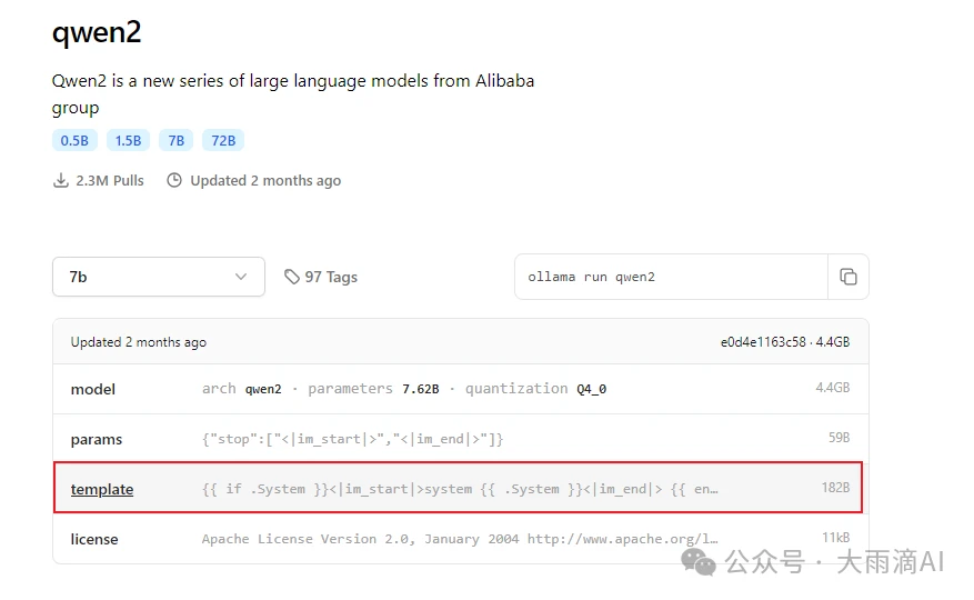 ● TEMPLATE - 这个很重要,通常HuggingFace的Model Card详情里面有相关信息,如果没有,则可以到 Ollama主页找相同的base模型,比如qwen2的标准模型的详情页面会提供。