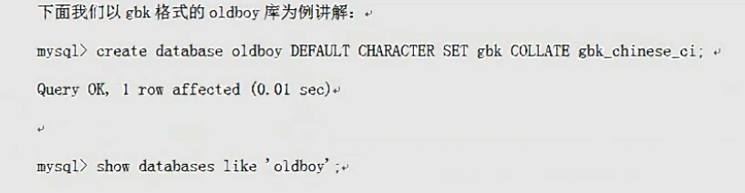 mysql>create database oldboy_gbk default character set gbk COLLATE gbk_chinese_ci;