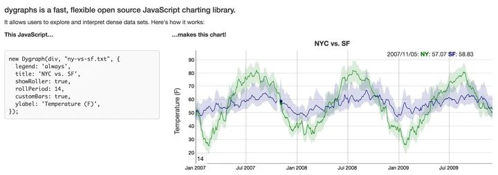 dygraphs是一个灵活的开源JavaScript图表函数库,主要用于金融图表,如股票K线图。dygraphs可以让人更好地探索和理解密集型数据,它生成的交互式时间序列图表支持鼠标悬停显示内容、缩放和平移,还支持实时数据更新和选择时间范围。