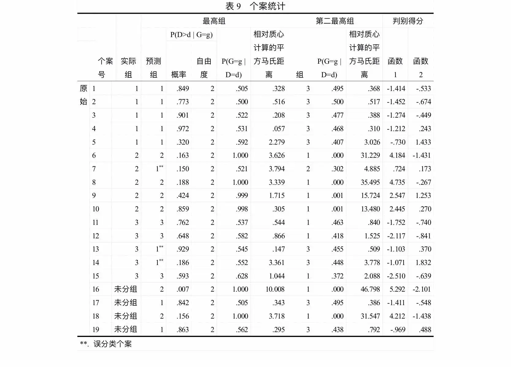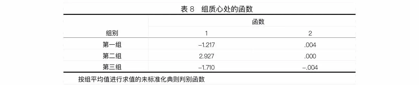 根据判别函数1计算每个观测的判断Z得分,根据表8结果,判别函数在第一组的重心为-1.217,判别函数在第二组的重心为2.927,判别函数在第三组的重心为-1.710。