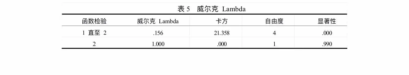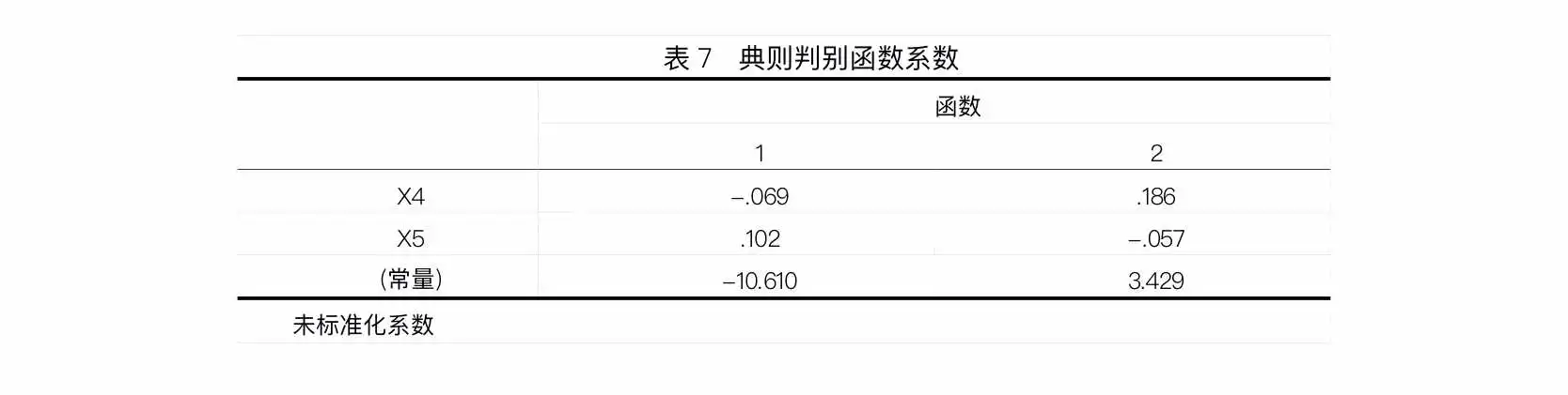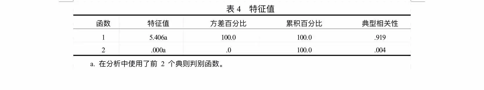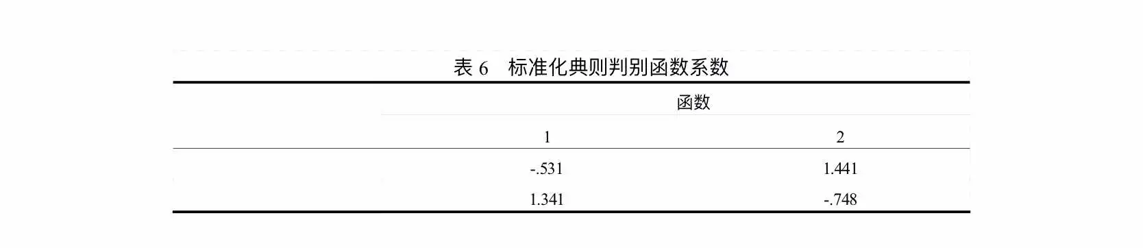 表4反映判别函数的特征值、解释总方差的比例、典型相关性。第一个判别函数解释了100%的方差,第二个判别函数未解释其方差。