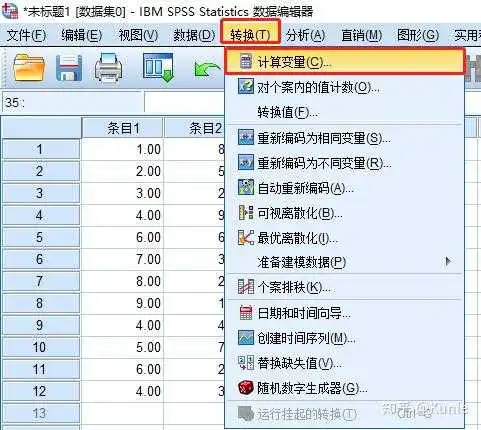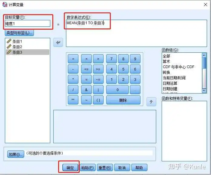 一种是:在菜单栏中选择“转换”下面的“计算变量”,在左侧目标变量中输入你要计算分数的名称,例如“维度1”,在右侧“数字表达”中,写出相应的计算公式,例如“mean(条目1, 条目2, 条目3)”或者“(条目1+条目2+条目3)/3”或者“mean(条目1 to 条目3)”,即可计算该维度的条目均分。