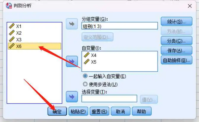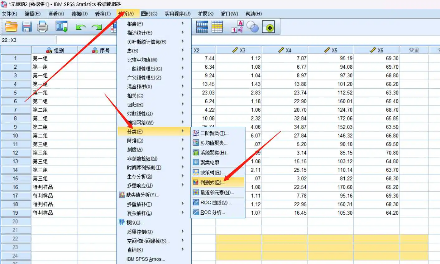 为判别另外4个样品的组别,选择Fisher判别法建立判别函数对其进行判别。