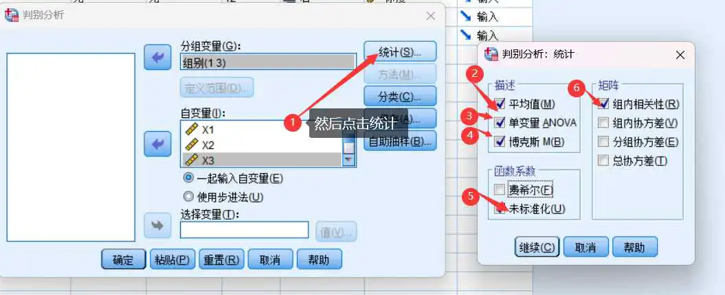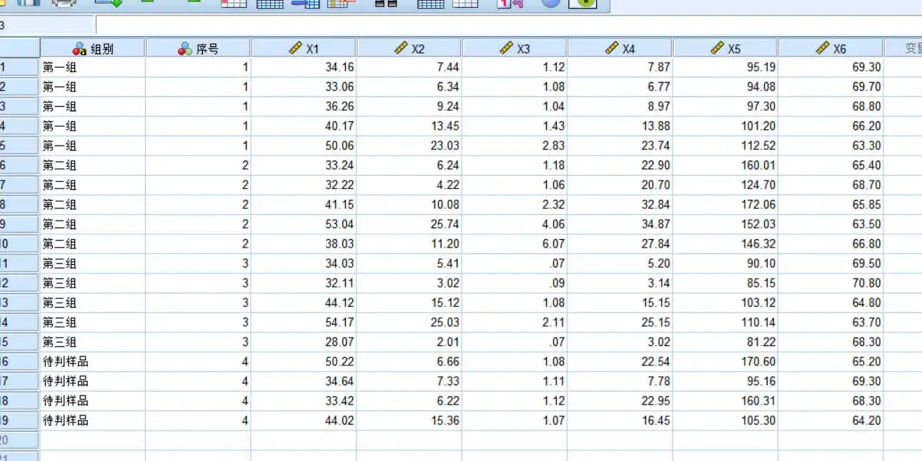 最后根据每个观测的判别Z得分对观测值进行分类,根据数据输出框输出结果可知,判断样本中1和3为第二组,2和4为第一组。其他样本中第二组中有一个,第三组中有两个被判错。