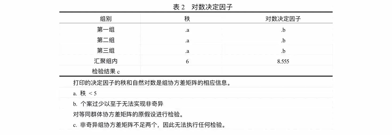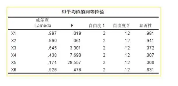 剔除变量、、,留下变量后重新运行得到表3,从表中可以看出,保留变量后,协方差阵是非奇异矩阵,F值对应显著性水平值为0.002,在显著性水平下,应拒绝原假设,认为各总体方差不相等。