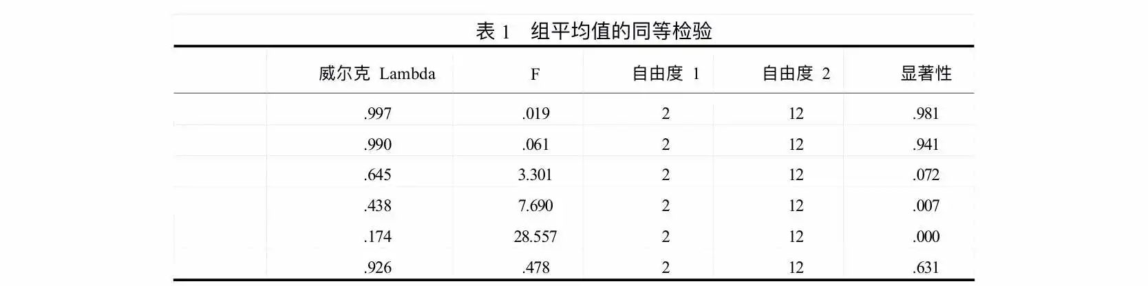 表1为组平均值的同等检验表,从中可以看出,在显著性水平下,变量、、的概率P值分别为0.981、0.941、0.072、0.631,均大于0.01,应接受原假设,认为变量、、在三组的均值是不存在显著差异。变量的概率P值分别为0.007、0.000,均小于0.01,应拒绝原假设,认为变量在三组的均值是存在显著性差异的。