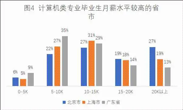 此外,受到地域影响,北京、上海、广东三省市均有超过一半的计算机类专业的从业者月薪在1万以上。