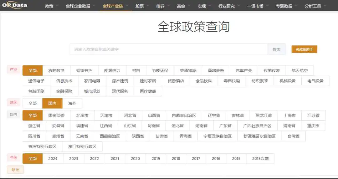 AI全球政策研究库包含全球2万+政策数据源,100万条政策,并可利用AI对全量政策进行分析。