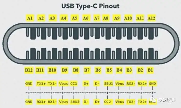 USB Type-C端口由24个引脚组成。USB最新规格(USB4)是仅支持USB-C的规格,也就是说,只有USB Type-C设备可以与USB4规格一起使用。以下是USB Type-C的引脚布局图。