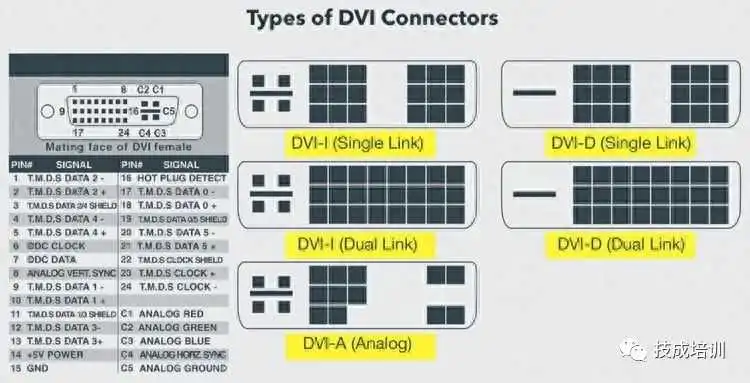 以下图像比较了DVI-I、DVI-D和DVI-A类型的结构以及引脚布局。
