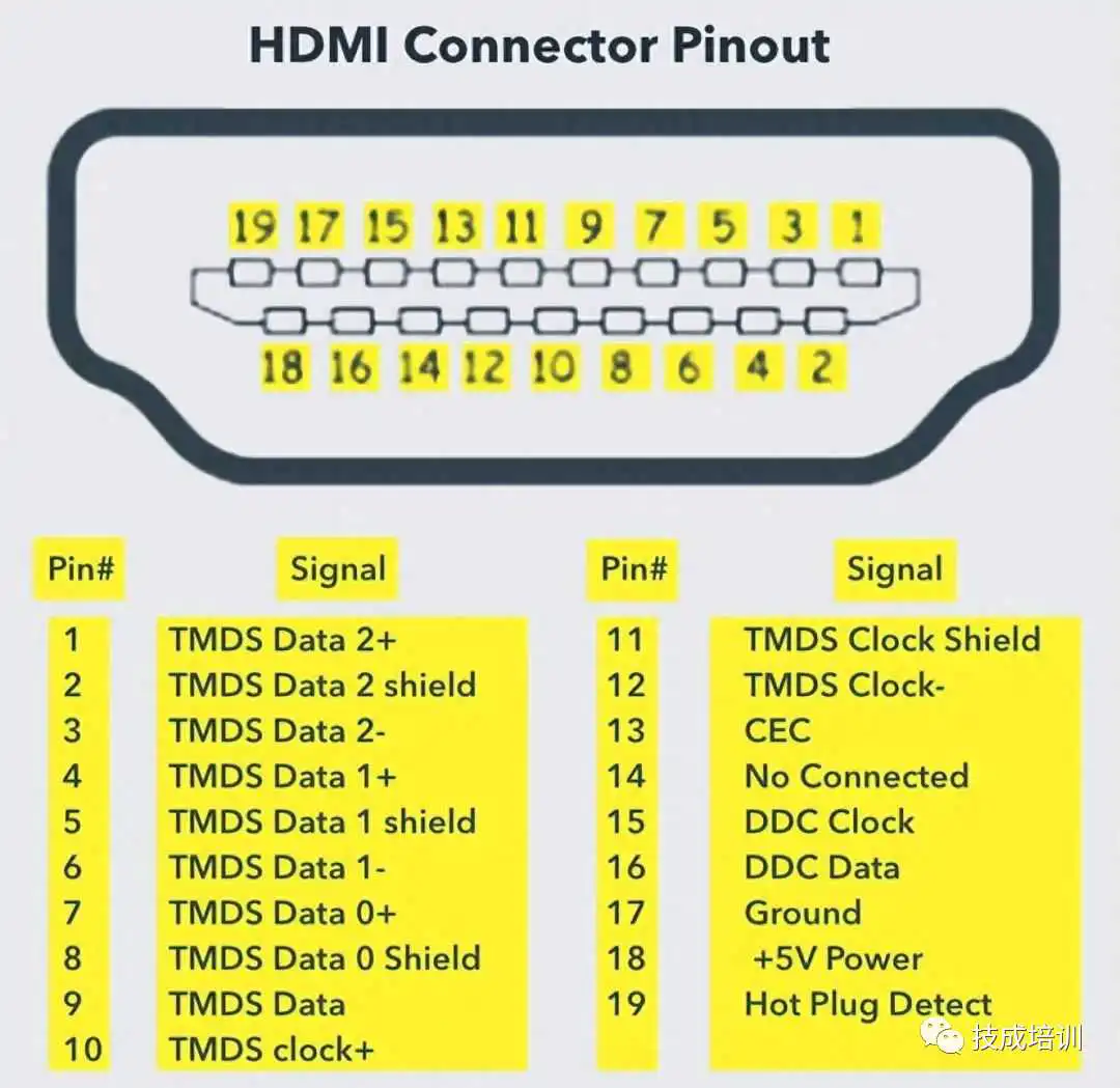 HDMI可以用于传输未经压缩的视频和经过压缩或未经压缩的音频信号。以下是A型HDMI端口的示意图。