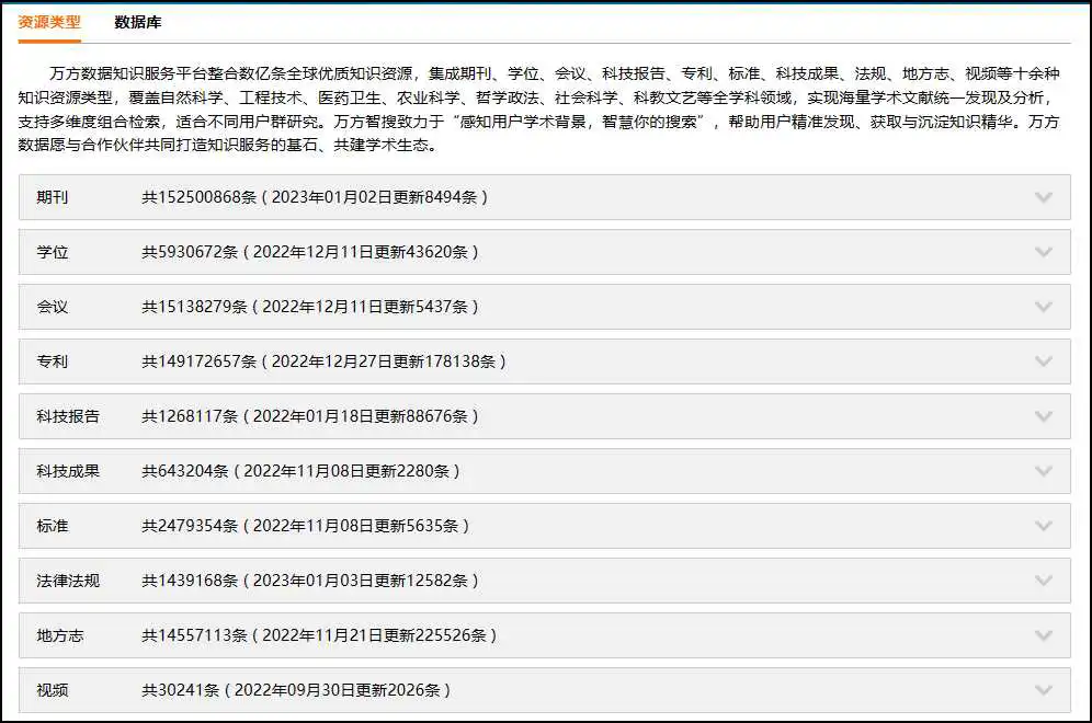 展示万方收录的资源类型及相关资源的更新情况介绍。