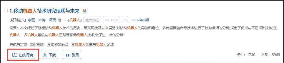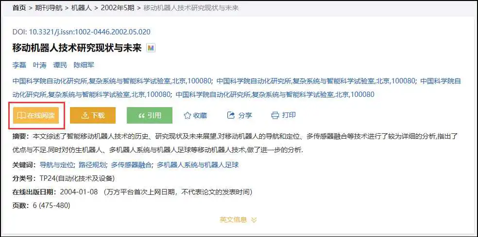万方智搜支持全文的在线阅读,包括期刊、学位、会议、专利、科技报告、法规、地方志资源。单击检索结果页面和文献详情页面的“在线阅读”按钮可以查看文献。