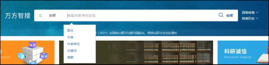 在统一检索的输入框内,用户可以选择想要限定的检索字段,目前共有5个可检索字段:题名、作者、作者单位关键词和摘要。