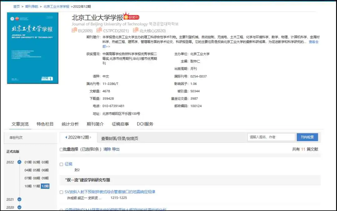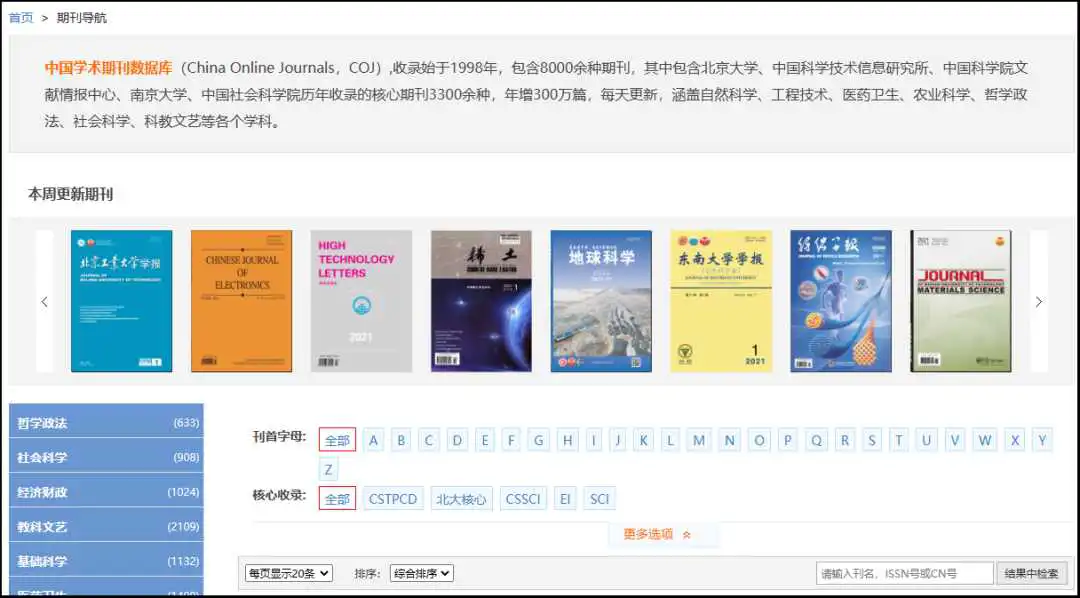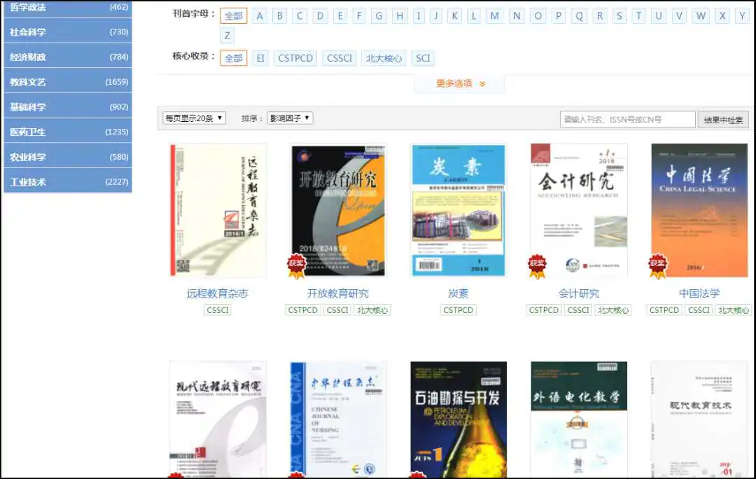 左侧为期刊的学科分类导航,中间部分为刊首字母、核心收录、收录地区、出版周期、优先出版的期刊导航。可对过创刊时间、影响因子、被引次数、更新日期排序。点击期刊,进入期刊详情页。