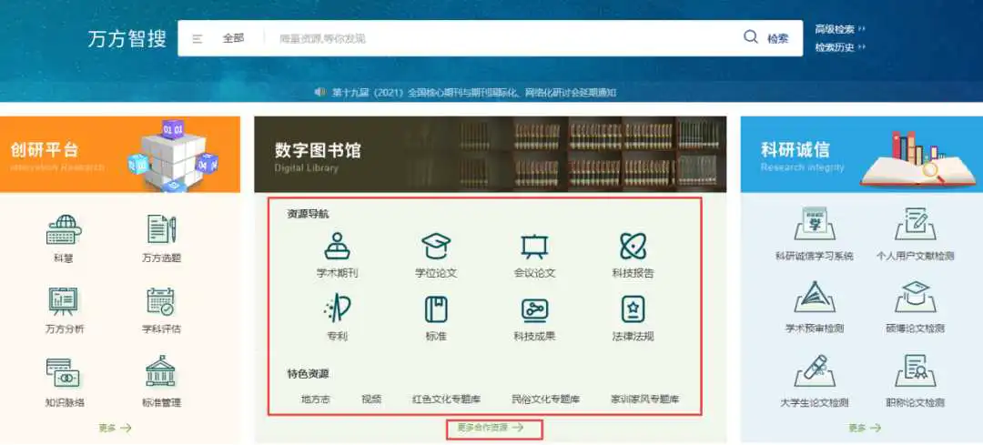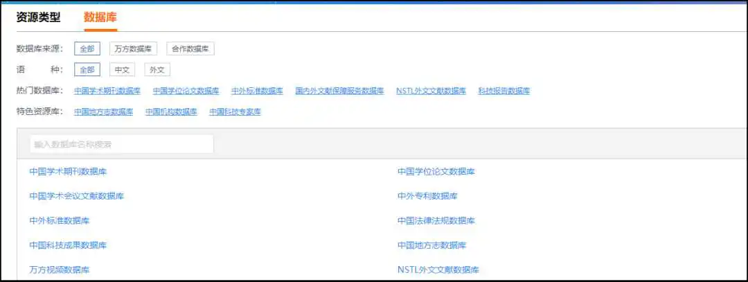 资源导航分为资源类型导航和数据库导航。从图书馆首页-资源-电子资源-数据库-中文数据库-万方数据知识服务平台即可进入。