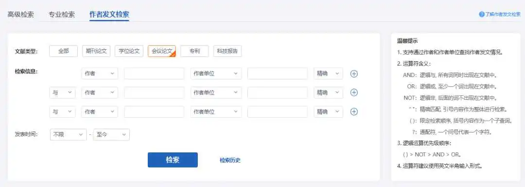 作者发文检索是通过输入作者姓名和作者单位等字段来精确查找相关作者的学术成果。用户可以选择想要检索的资源类型,通过+或者-添加或者减少检索条件,通过“与”、“或”和“非”限定检索条件进行检索。可以检索第一作者,并且能够同时检索多个作者的成果。