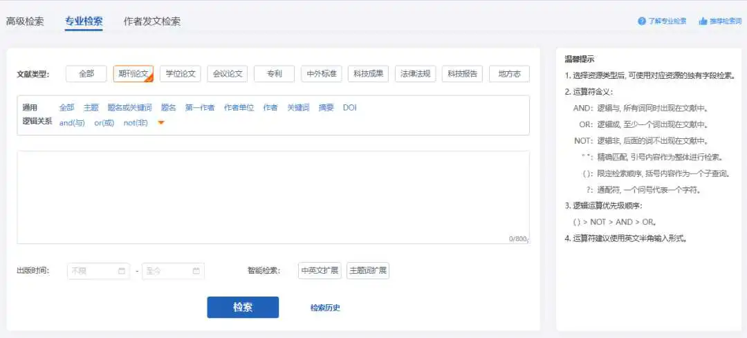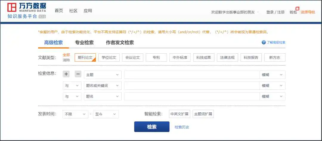 万方智搜检索框的右侧有高级检索的入口,单击进入高级检索界面。高级检索支持多个检索类型、多个检索字段和条件之间的逻辑组配检索,方便用户构建复杂检索表达式。