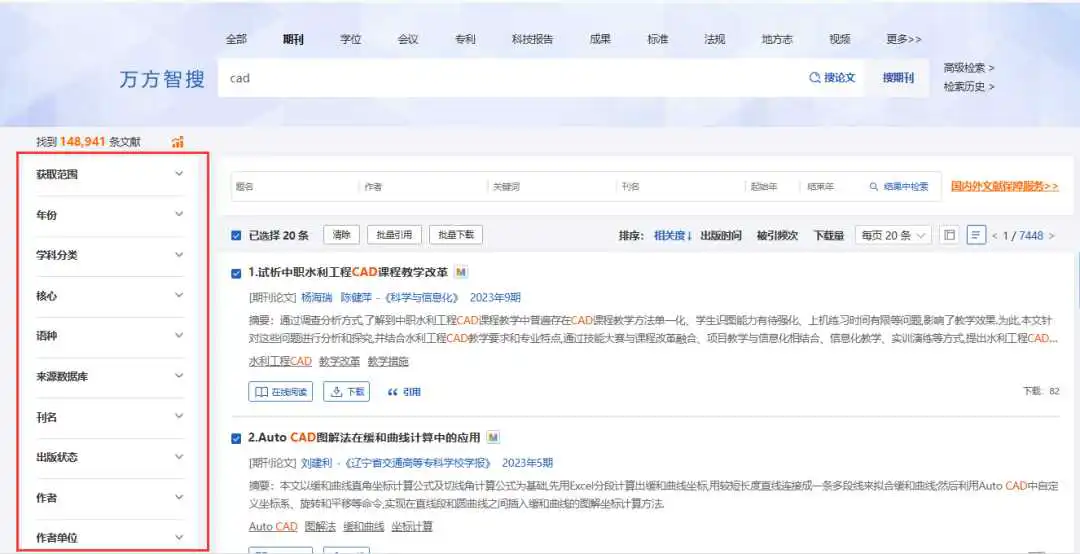 例如,期刊的检索结果页面下,可以通过出版时间、学科分类、核心收录、语种、来源数据库、刊名、出版状态、作者、机构等限定对期刊论文进行筛选。