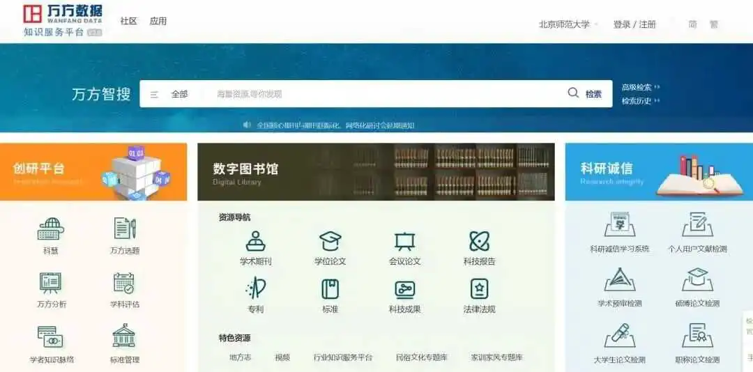 🔷 万方数据:综合型的中文数据库,我馆订购了该平台8个子库,涵盖期刊、会议、学位论文、标准、专利等丰富资源。