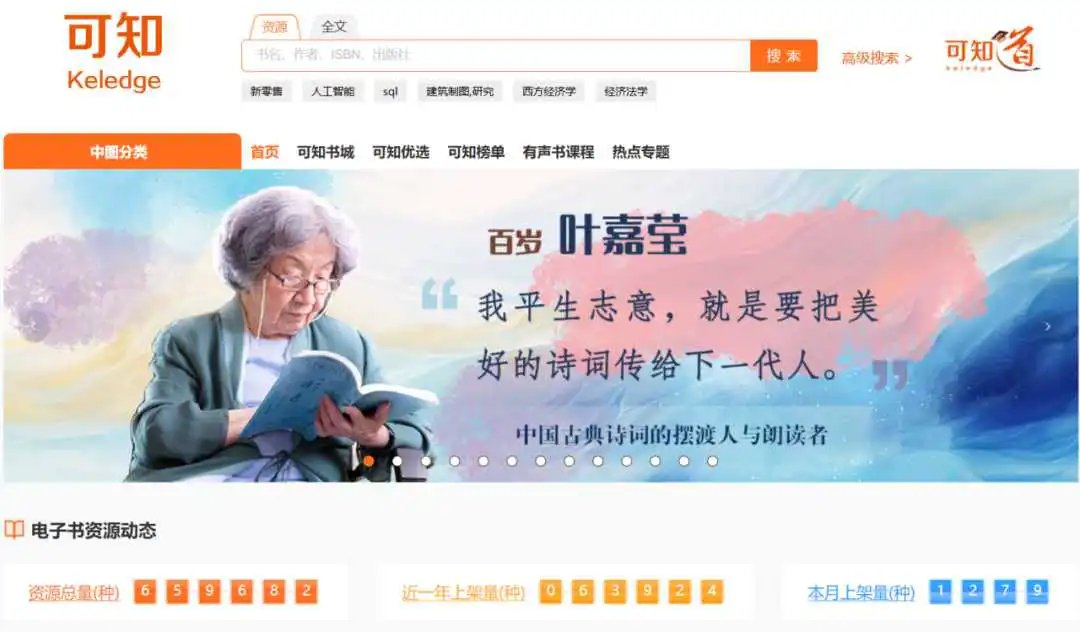 可知电子书:读史使人明智,读诗使人灵秀。可知电子书包含包含多家知名出版社共36万余册正版电子书,涉及文学小说、人物历史、政治军事、科学新知、教材教参等多种类型,其中不乏畅销书。可在线阅读我馆已采购图书、5天内全文阅读我馆未采购图书。