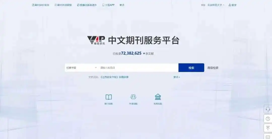🔷 维普期刊资源整合服务平台:中文期刊数据库,提供多层次、纵深度的集成期刊文献服务,包括全文服务、期刊导航、引文服务、指标服务、排名分析、学科评估、期刊报告等。