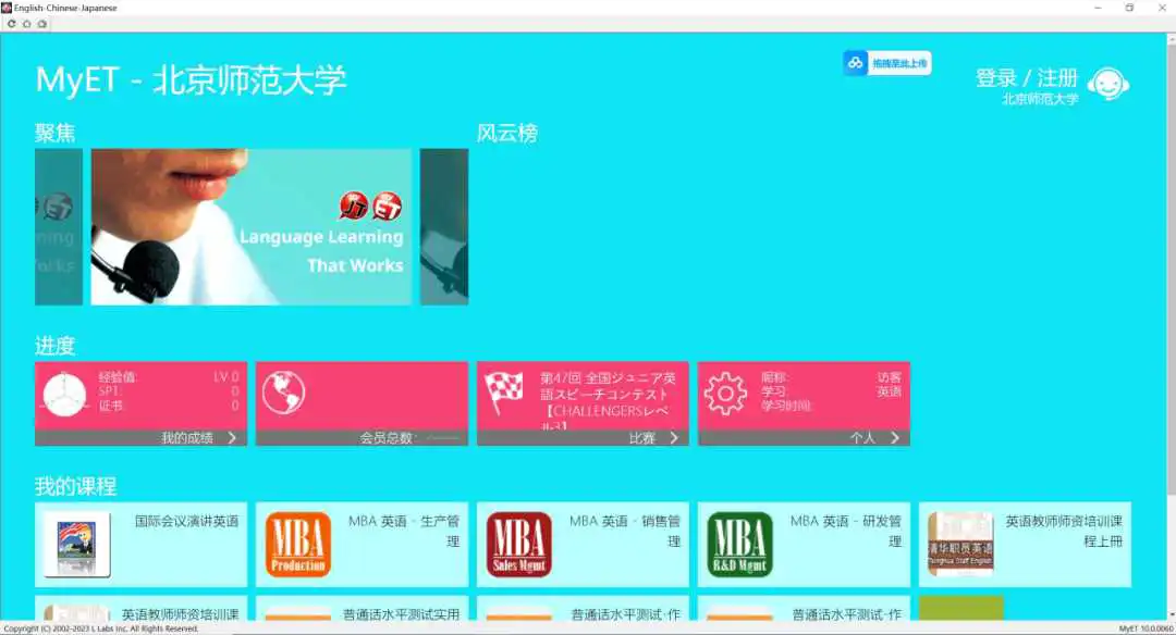 🔷 MyET 英语多媒体资源库:一对一英语口语练习客户端,配备自动语音分析系统,从发音、流利度、语调、音量角度考察并提供改善建议。还有"自我检测"板块,看看自己的口语实力如何吧!