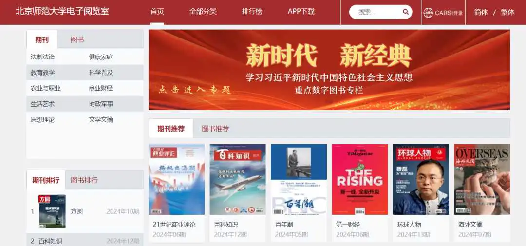 龙源阅览室:龙源阅览室以人文大众期刊为主,如《读者》、《意林》、《新民周刊》、《中国新闻周刊》等大众喜爱的期刊,此外还有部分图书和专业学术期刊。支持多终端阅读、微信小程序扫码借阅。