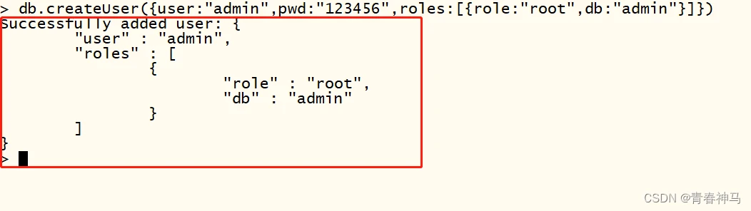 use admin 表示进到admin库,db.createUser({user:“admin”,pwd:“”,roles:[{role:“root”,db:“admin”}]})表示创建一个用户名是admin,密码是,角色权限为超级用户角色,db则针对的库