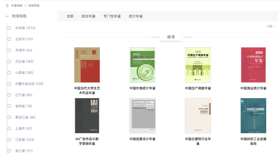 收录中国国内的中央、地方、行业和企业等各类年鉴的全文文献。
