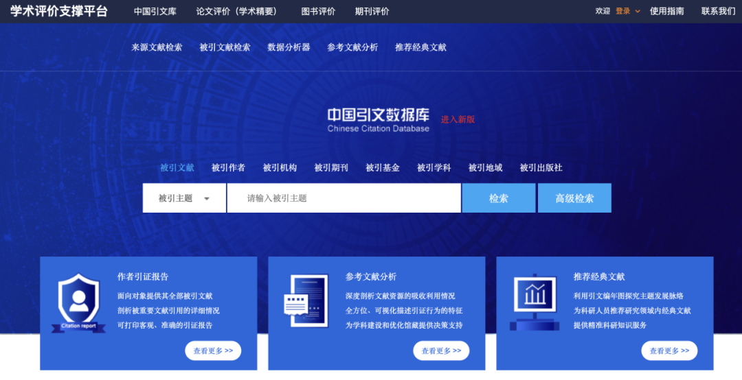 《中国引文数据库》是基于CNKI源数据库文献的文后参考文献和文献注释为信息对象建立的一个规范的引文数据库。引文数据涵盖期刊(中外文)、博硕士学位论文、国内/国际会议论文、图书、中国专利、中国标准、年鉴、报纸等文献类型引文。通过揭示各种类型文献之间的相互引证关系,不仅可以为科学研究提供新的交流模式,而且也可以作为一种有效的科研管理及统计分析工具。