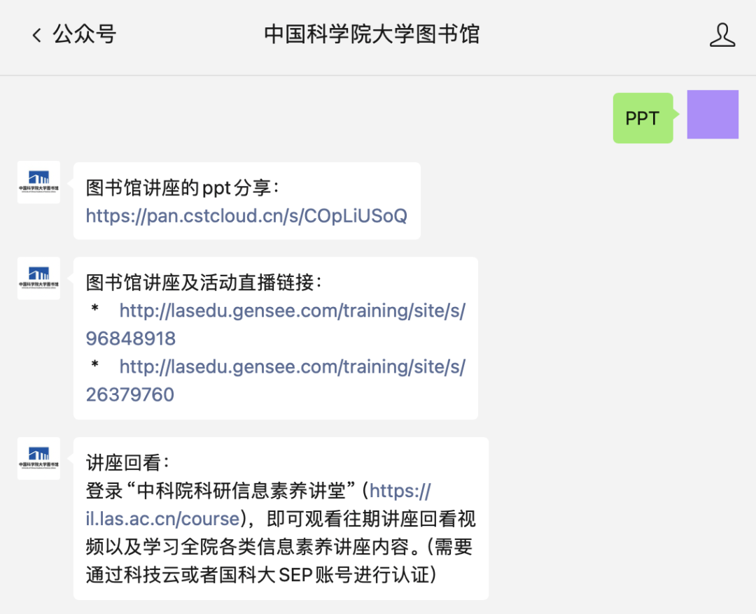 “巧用中国知网 开启AI智能化学习研究”讲座的PPT可通过在中国科学院大学图书馆公众号回复“PPT”的方式获取。