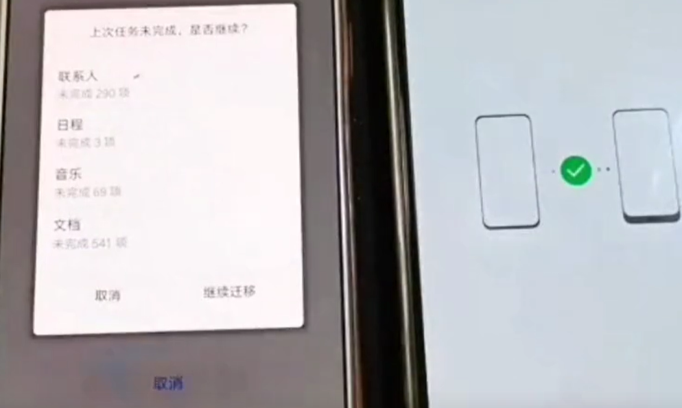现在就连接成功,然后我们就可以点击旧手机上面的开始迁移,点击知道,现在就开始把这个旧手机上的数据往新手机上迁移,需要的时间,大概要十几分钟,这个时间的长短,都是根据我们手机里的数据大小来决定的。