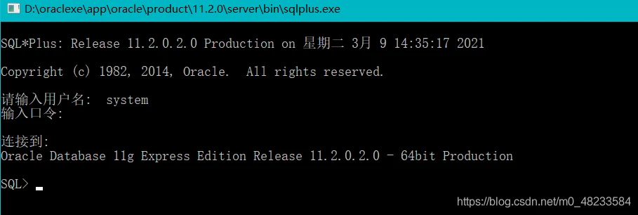 Oracle Database 11g Express Edition Release 11.2.0.2.0 - 64bit Production” 语句时,则安装成功!可以使用,如下图所示。