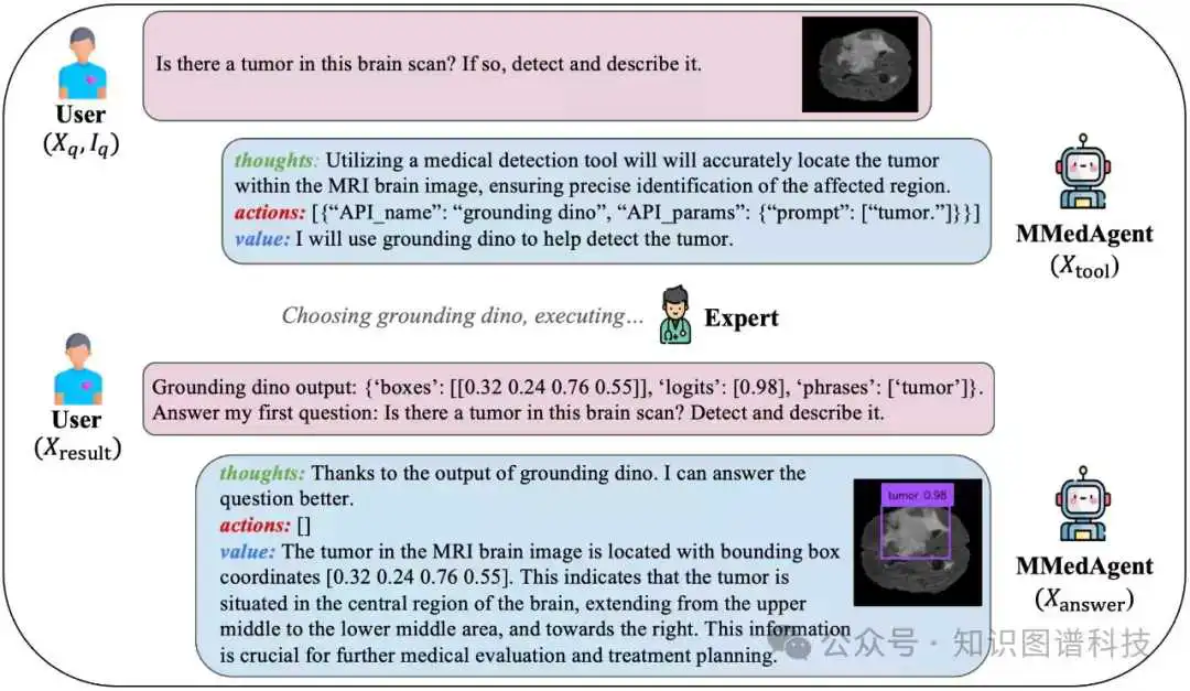 是指将接地与 SAM 相结合。它旨在解决用户仅指定要在图像中分段的特定对象时更常见的情况。我们首先激活微调接地工具以定位所引用的物体,然后以框格式将其位置提供给 MedSAM。请注意,此任务还展示了 MMedAgent 使用多个工具处理复杂任务的能力,这是以前的工作中没有的能力。