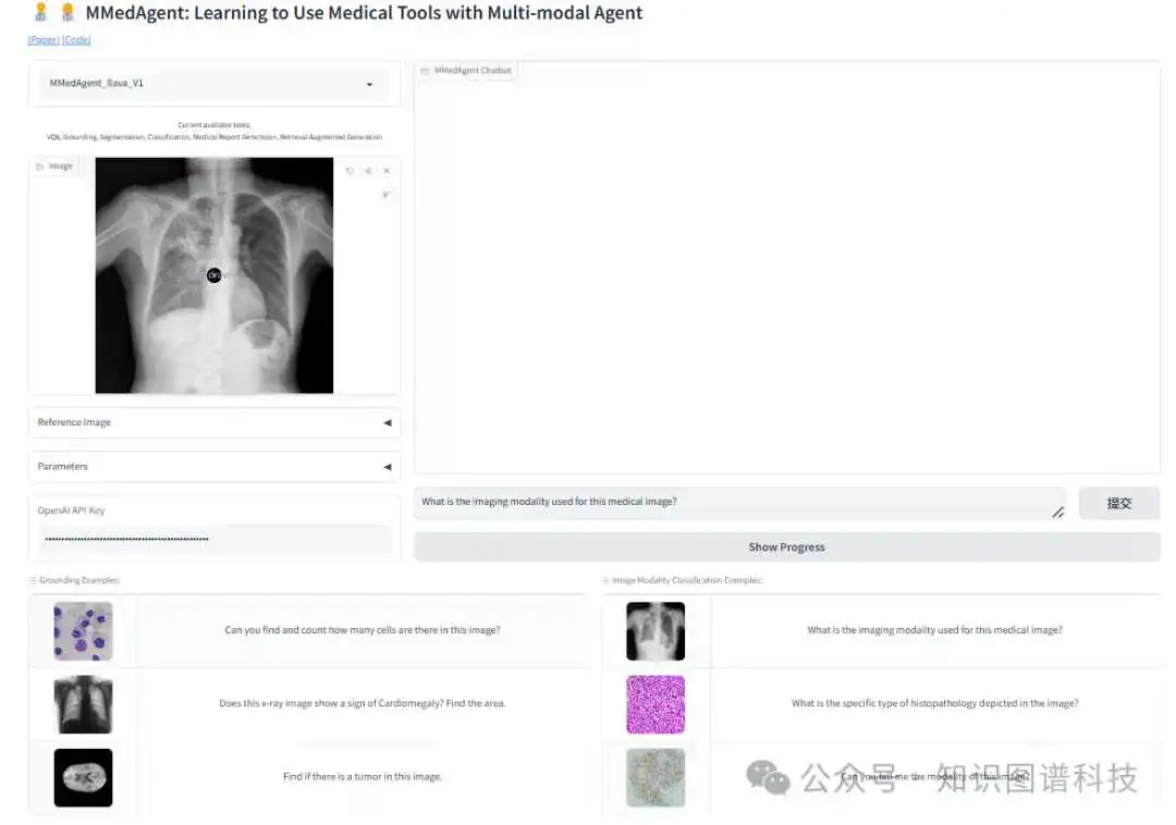 涉及根据提供的医疗信息或成像创建准确和真实的医疗报告。MMedAgent 结合了 ChatCAD ,一种开源工具,旨在为胸部 X 光图像生成医疗报告。该模型在 MIMIC-CXR 数据集上进行训练,可以提供包含详细放射学分析的报告,识别与胸部相关的疾病,例如心脏扩大、水肿、实变、肺不张等。