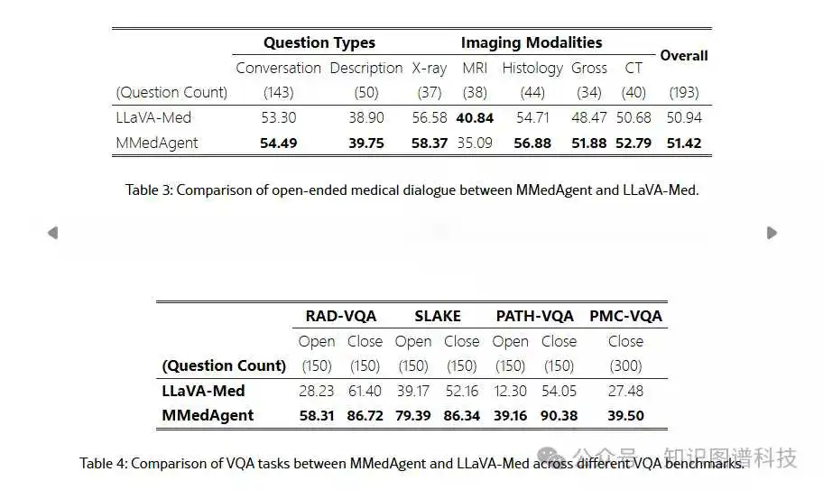 如 表3所示,从问题类型(对话和描述)和图像模态(X 射线、MRI、组织学、大体和 CT)的角度评估性能。在对工具学习数据集进行指令调整后,MMedAgent 在这两种类型的问题上都表现得更好。此外,MMedAgent 在除 MRI 之外的所有领域都优于 LLaVA-Med,证明了 MMedAgent 在开放式医学对话中的效率。