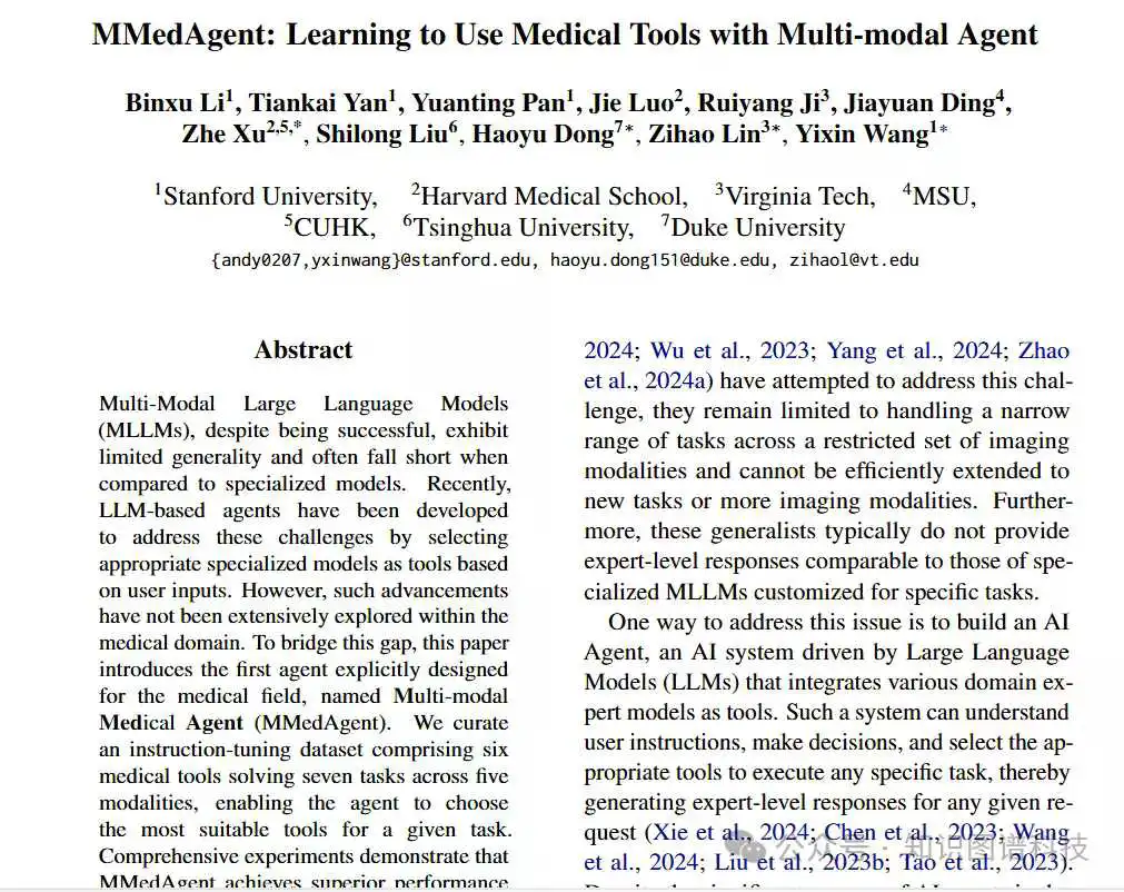- 广泛的实验表明,MMedAgent 在一系列任务中超越了以前的 SOTA 多模态医学语言模型。