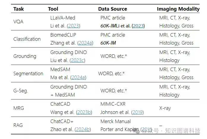 表 1:MMedAgent 中包含的任务、工具、数据源和相应的医学成像模式。“–” 表示 RAG 任务只关注自然语言,而不处理图像。“WORD 等*”表示各种数据源,包括 WORD 、 FLARE2021 、 BRATS 、 蒙哥马利县 X 射线集 (MC) 、 VinDr-CXR 和 Cellseg 。