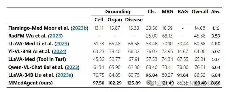 此外,器官grounding、疾病grouding和 MRG 的分数超过 100%,表明 MMedAgent 在这些任务中超过了 GPT-4o。这些结果强调了 MMedAgent 在各种模式的各种医疗任务中的卓越效率。