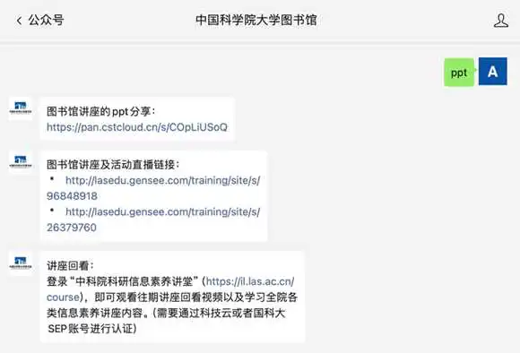 “外文文献检索工具介绍与应用”讲座的完整PPT可通过在图书馆公众号回复“PPT”的方式获取。欢迎同学们积极获取学习!