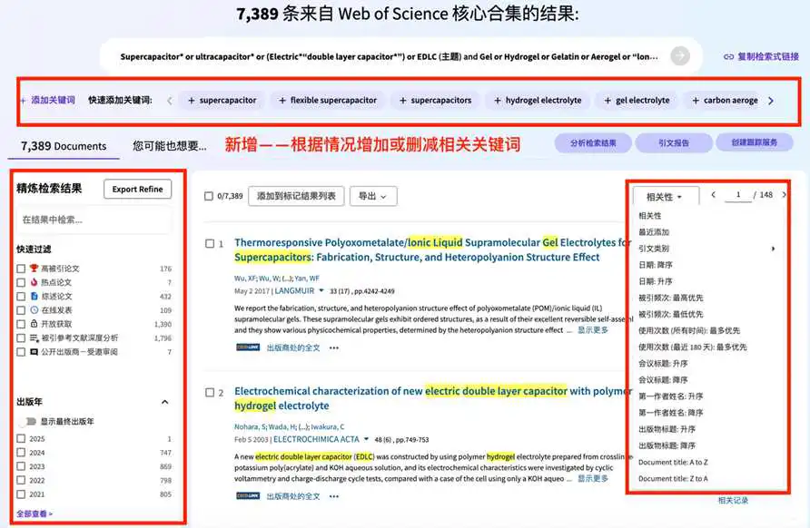 在检索结果页面,可以根据需求进一步筛选文献结果。
