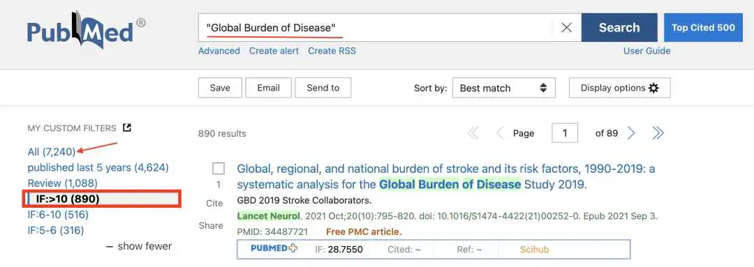 当然,一些影响因子 3~10 分/一区二区的期刊,GBD 数据库更是经常出没,今天 PUBMED 检索了一下,6~10 的有 516 篇,10 分影响因子高达 890 篇,高分率将近 20%!所以,GBD 是你非常好的发文选择,赶快学起来吧!
