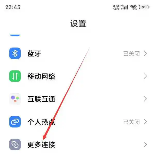 1.打开手机“设置”,在设置中点击“更多连接”;
