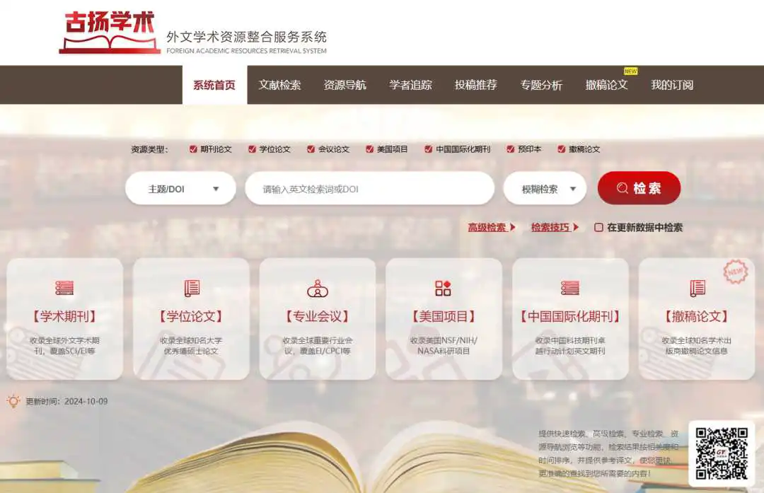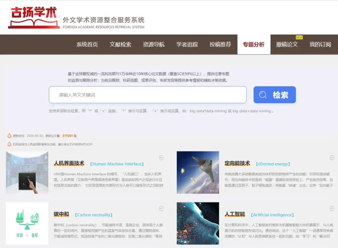 古扬外文学术资源整合服务系统(FARS)是集一站式检索、投稿推荐、专家发现、专题分析、信息定制于一体的学术科研信息服务平台,集成了上亿条各类优质外文学术资源,全面收录SCI、EI、重要国际会议、全球名校博硕论文、美国科研项目以及中国国际化期刊(英文)等覆盖资源;包含基础科学、工程技术、农业与生物、生命科学、医药与卫生、社会科学、人文科学、教育学、综合等全部学科领域。具有资源覆盖面广、更新快、智能分析、中文辅助等特点和优势。